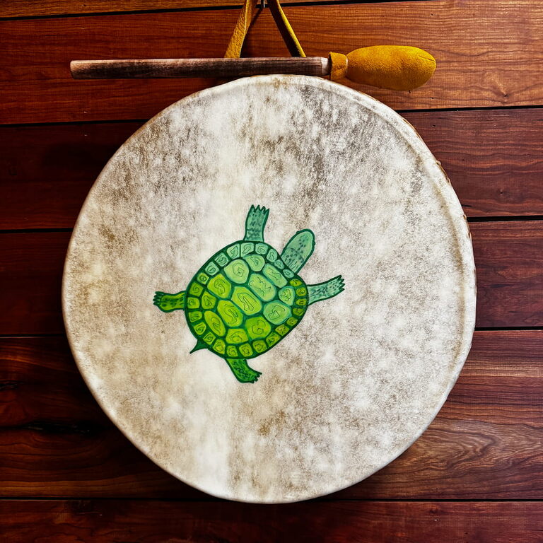 That is what we do…we cut our own wood (white ash) and on our hands and knees we bend our hoops to be as round as possible. Drums that are 100% round are factory made hoops. At any gathering on Turtle Island you can look around and see our drums. They stand out, they are organic…hand made. We like them ‘old school’ and hope that you do too. 100% Canadian !